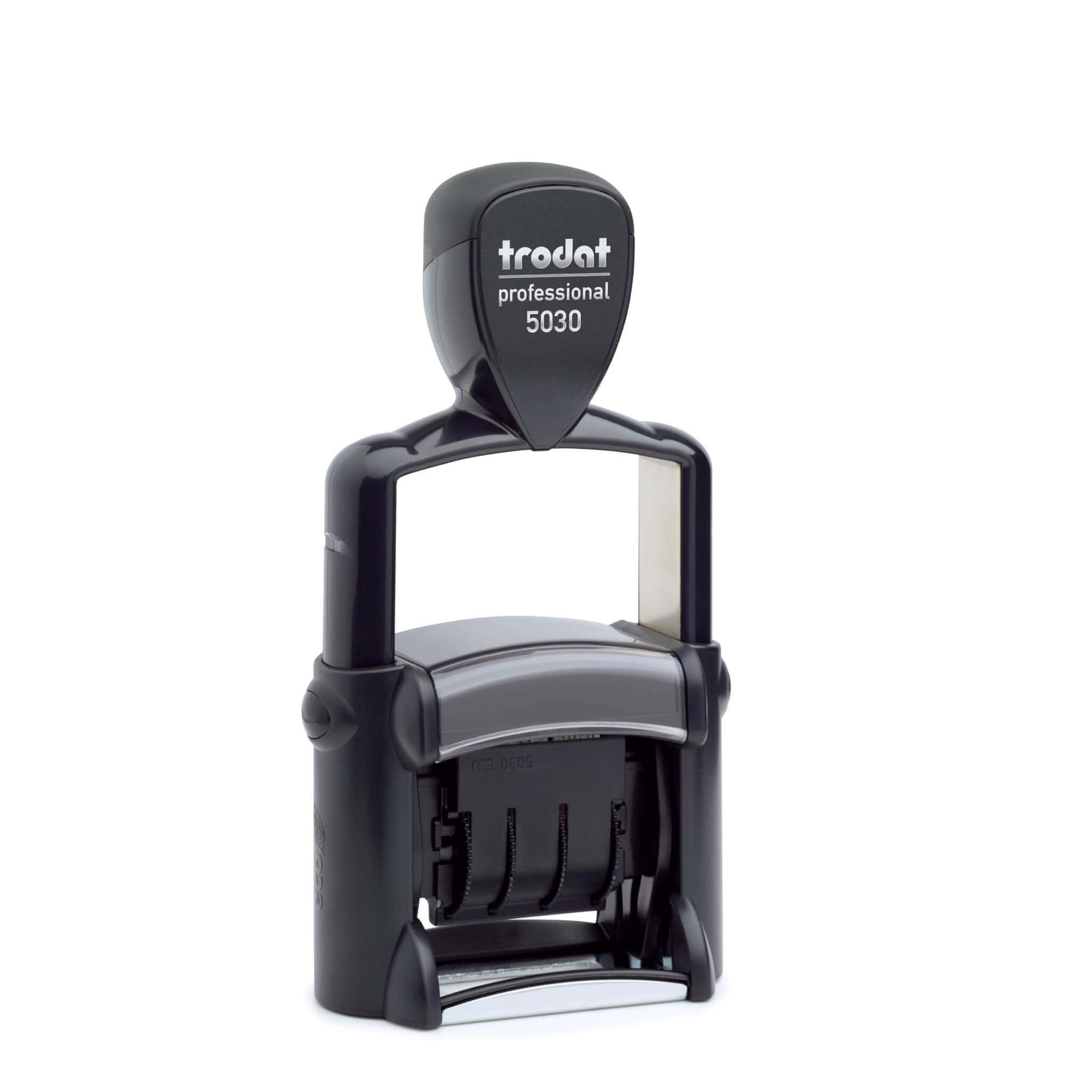 Trodat Professional 5030 Metal Date stamp, durable metal frame construction and ergonomic handle it is the ideal stamp for daily office use. Available in 5 standard colours and dry for custom and speciality inks.