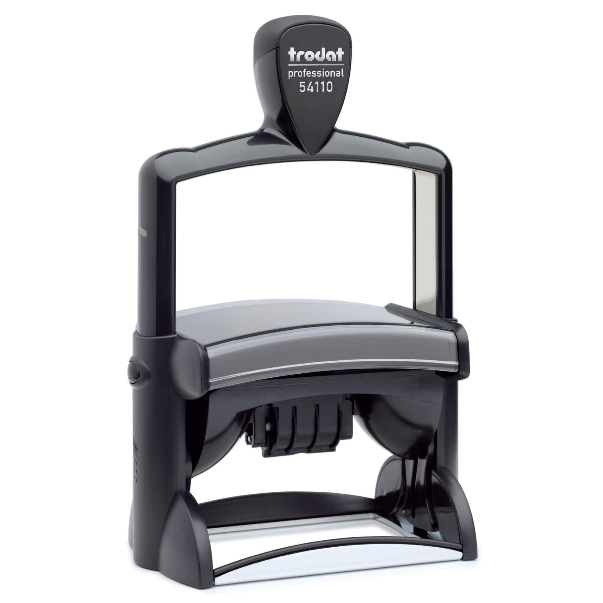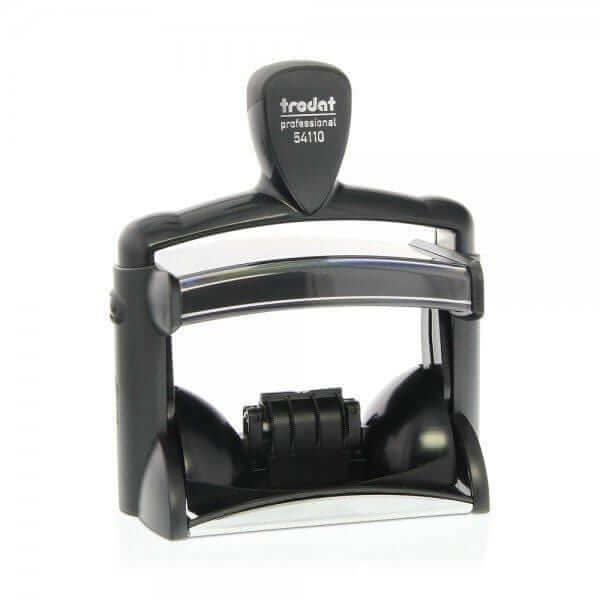 Trodat Professional 54110 date stamp with an extra large 85 x 55mm Impression plate, 4mm centred date, durable metal frame construction and ergonomic handle it is the ideal stamp for daily office use. Available in 5 standard colours and dry for custom and speciality inks.