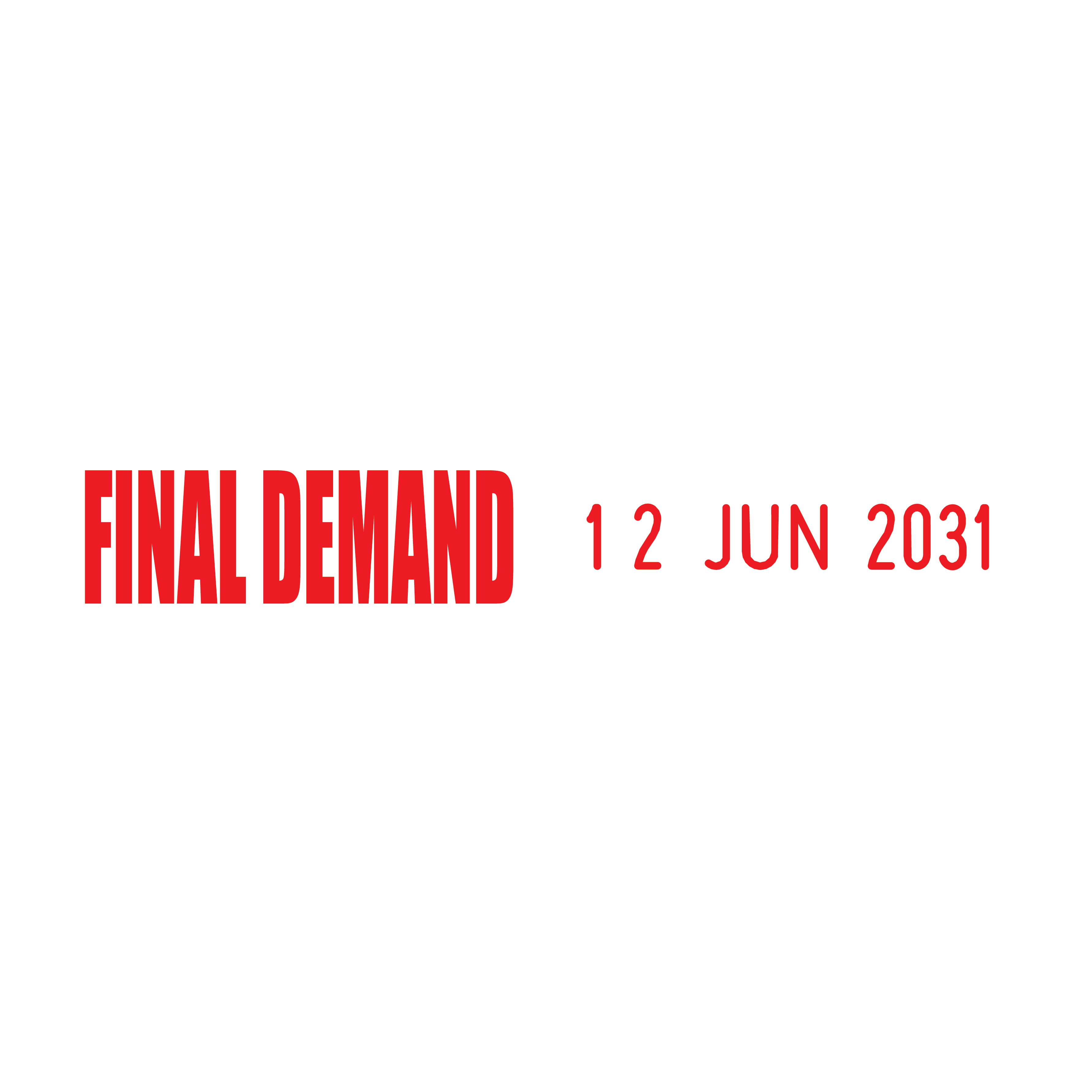 Ensure that your critical payment requests are noticed with the Final Demand Side-by-Side Date Stamp. This 48mm wide stamp features the text "Final Demand" in a 23 x 7mm size, alongside a changeable date section measuring 3.8 x 20mm, presented in a 01 JAN 2031 format. Ideal for businesses that need to communicate payment deadlines effectively.