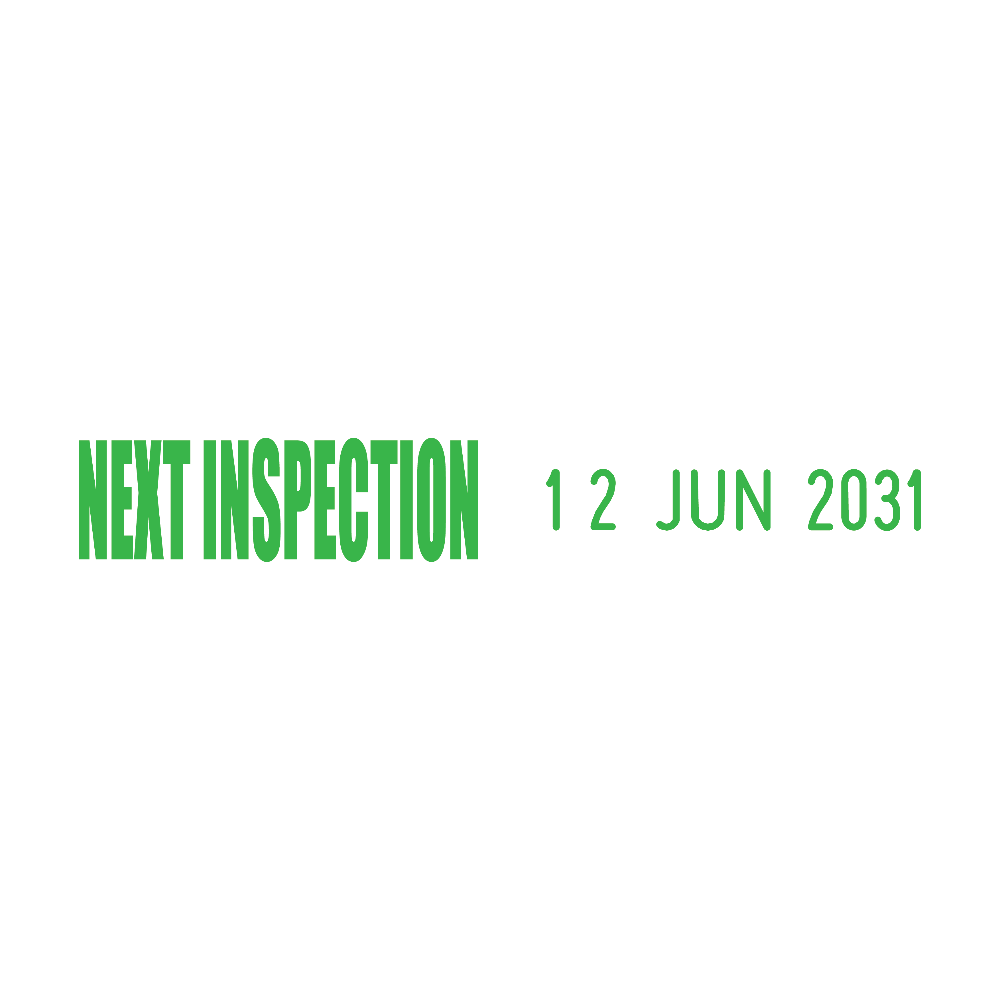 The Next Inspection Side-by-Side Date Stamp is a must-have tool for businesses and organisations that require regular inspections to maintain safety and compliance. This 48mm wide stamp features the "Next Inspection" text in a 23 x 7mm size, accompanied by a changeable date section measuring 3.8 x 20mm, displayed in a 01 JAN 2031 format.