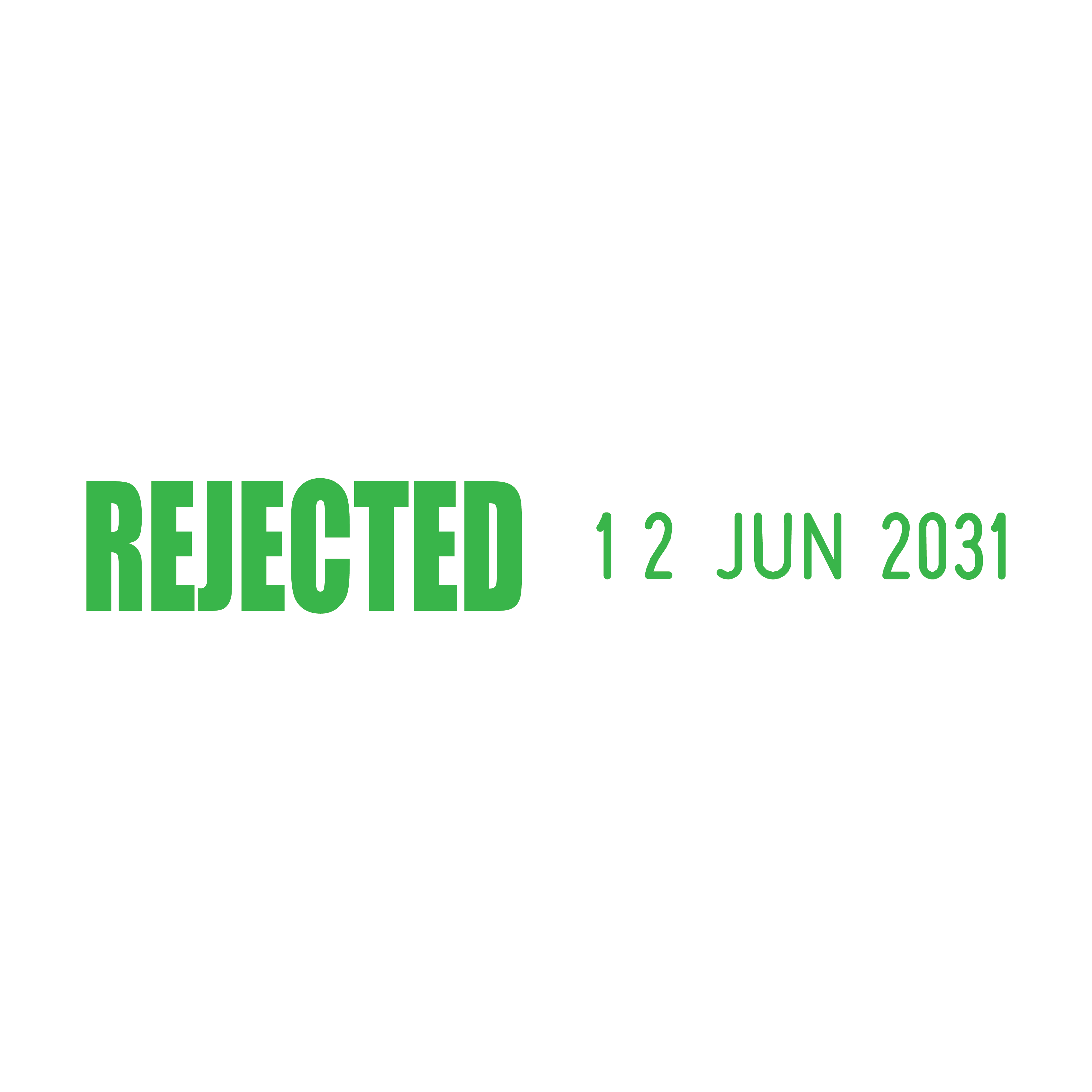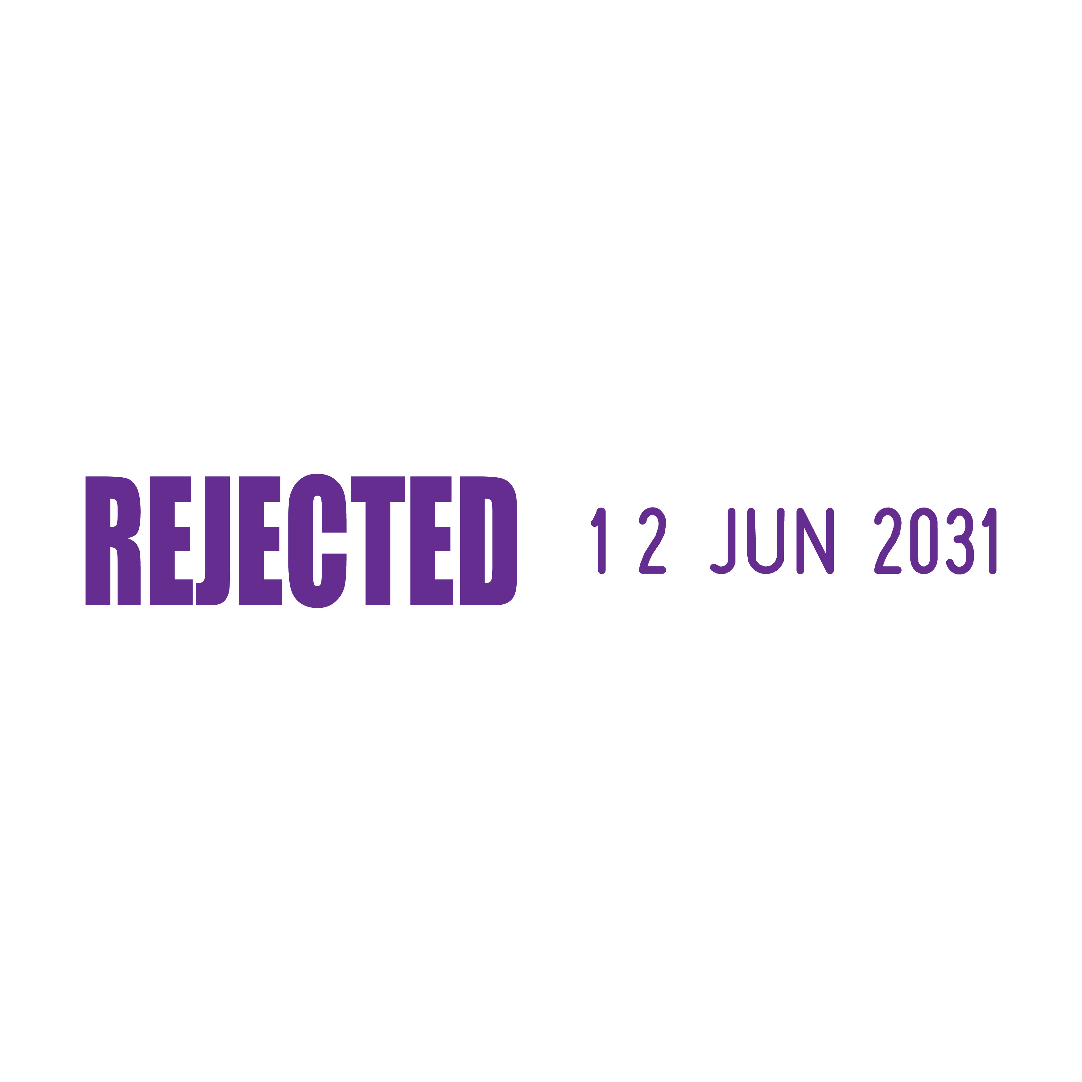 The Rejected Side-by-Side Date Stamp is an essential tool for businesses and individuals who need to clearly mark documents as rejected. The stamp features a 23 x 7mm "REJECTED" text next to a changeable date section measuring 3.8 x 20mm, with an overall width of 48mm. The date format is displayed as 01 JAN 2031, ensuring clarity and easy readability.